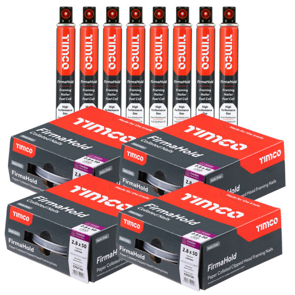 Explore our full range of Timco FirmaHold nail and gas bundle deals, ideal for busy tradesmen working on structural framing or finishing jobs. From clipped head nails to straight and angled brads, each trade pack includes fuel cells and is fully compatible with top-brand nail guns.