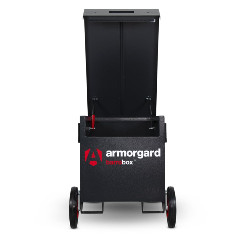 The Armorgard BarroBox™ BB2 is a unique mobile site box with retractable wheels, anti-jemmy features, 5-lever deadlocks, gas struts and SlamStop lid stay. Secure, mobile and versatile tool storage. Size: 765 × 1045 × 720 mm.