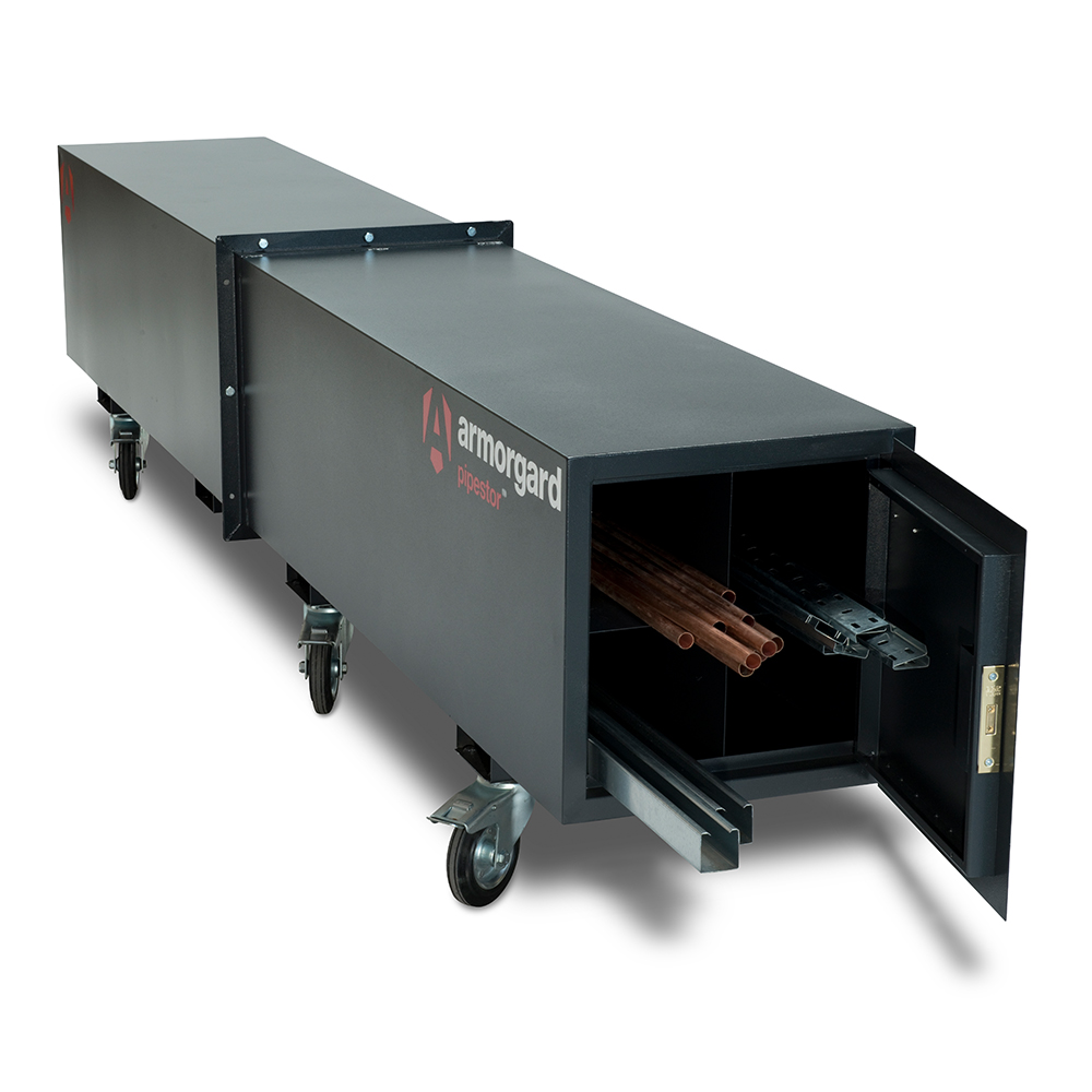 The Armorgard Pipestor™ PS3 is a secure, mobile pipe store for lengths up to 3 metres. With a 5-lever deadlock, four internal compartments, and heavy-duty castors, it keeps copper pipes and conduit safe, organised, and easy to move around site.