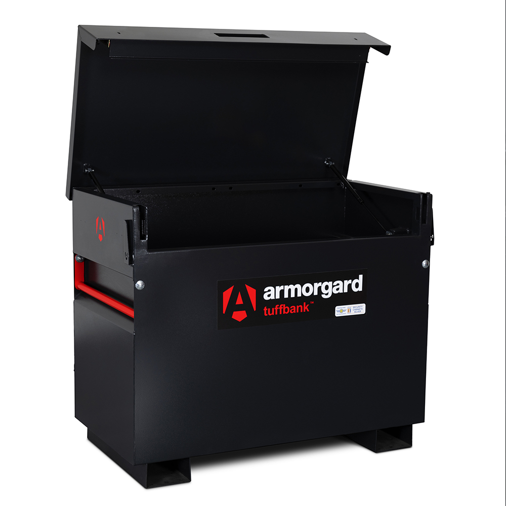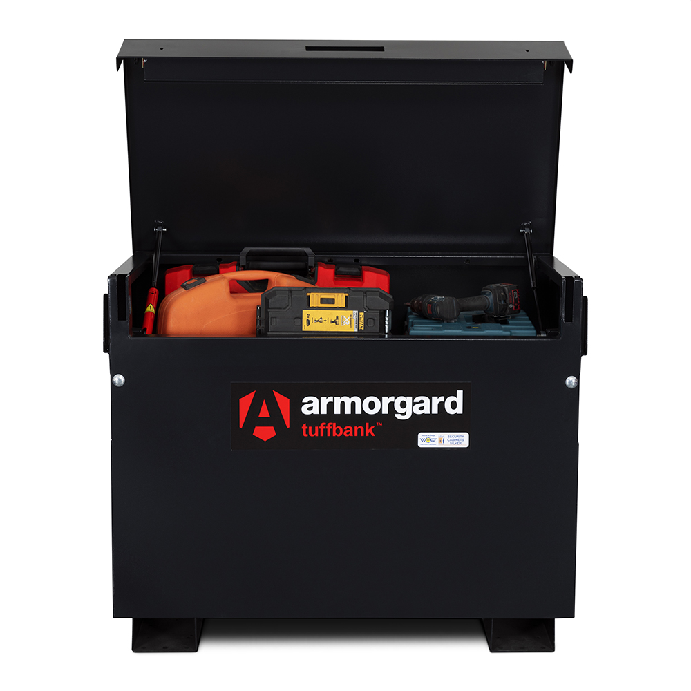 The Armorgard TuffBank™ TB3 Site Box offers secure tool storage for construction sites and workspaces. With IntaLokt locking, 5-lever deadlocks, anti-jemmy plates, gas struts, SlamStop lid stay and a replaceable lid, it combines advanced protection with practical usability. Size: 1150 × 615 × 930 mm.